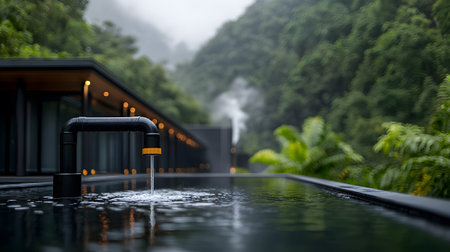 A black water pipe gently pours steaming water into a tranquil pond, surrounded by lush greenery and misty hills. The atmosphere exudes peace and harmony with nature's beauty.