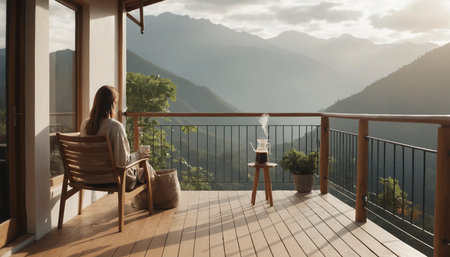 Woman sitting on terrace with view on mountains and foggy morning ai generated.“This image was created using generative artificial intelligence tools