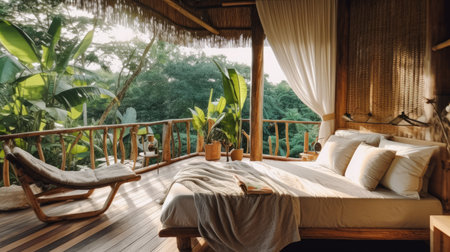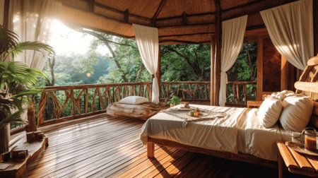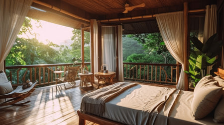 Resort bedroom in wooden style with balcony open to the natural view. Generative AI image AIG30.