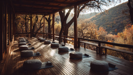 Empty, covered wooden deck designed for meditation or gentle exercise, featuring several floor cushions resting on yoga mats arranged in rows. The structure has rough-hewn wooden posts and railings, opening up to a view of a densely wooded valley and rolling hills bathed in warm morning or afternoon sunlight filtering through the canopy.