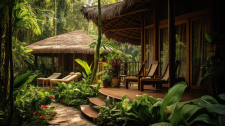 Secluded jungle lodge amidst lush foliage with traditional thatched roof