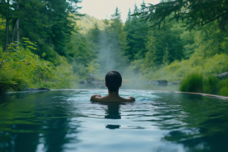Tourist relaxing in a natural hot spring, soaking in the warm geothermal water while surrounded by a lush green forest landscape