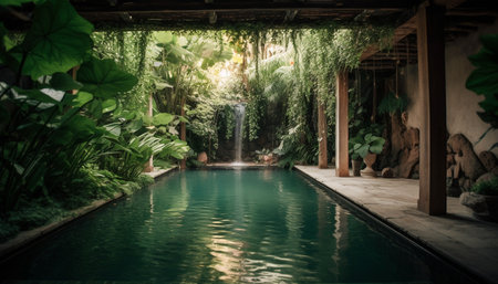 forest oasis, with waterfall pouring into pool and surrounded by lush greenery, created with generative ai