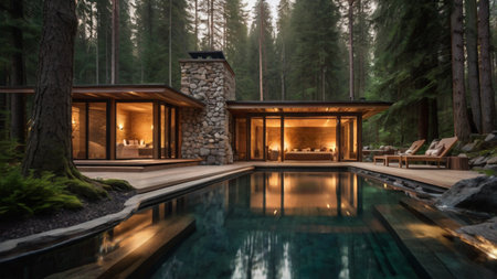 3d rendering of modern cozy chalet with pool and parking for sale or rent. Massive timber beams columns. Cool summer night with shiny reflective water.