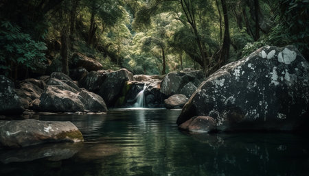 Tranquil scene of flowing water in forest generated by artificial intelligence