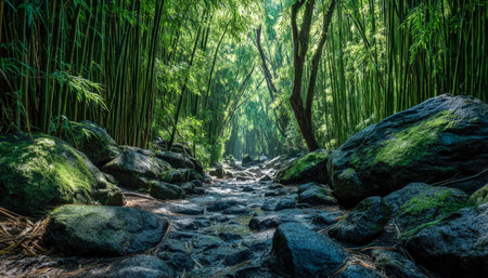 Serene lush bamboo grove with smooth stones and a quiet, flowing stream creates a peaceful natural retreat with vibrant greens and calming ripples.