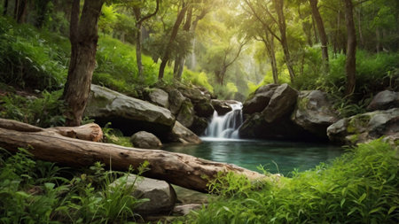 AI Generated. Serene hidden forest pool with cascading waterfall and natural rock formations