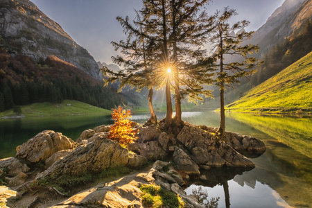 Beautiful alpine landscape with lake on sunset in Switzerland, autumn.