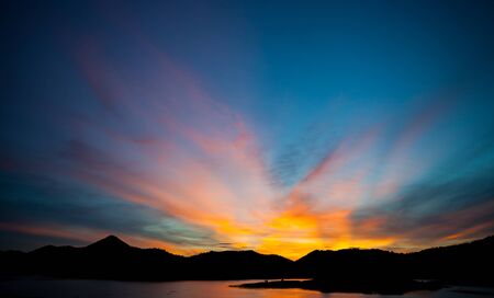 Sunset landscape with orange sky, silhouettes of mountains, hills and trees and lake