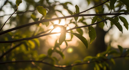 Bright sunlight bursts through the green leaves of tree branches, creating a beautiful silhouette and lens flare effect. The image captures the essence of spring, growth, and the peaceful beauty of nature.