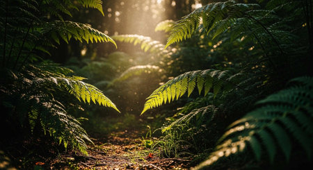 Sun rays breaking through trees in a tranquil forest setting at dawn
