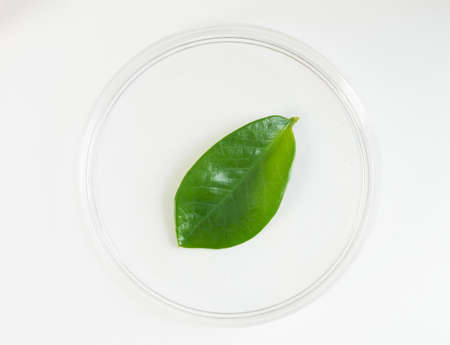Herbal pharmacology and microbiology concept. Green leaf in petri dish on desk. Organic chemistry laboratory analysis and experiment. Essential oil extract production for cosmetic industry.
