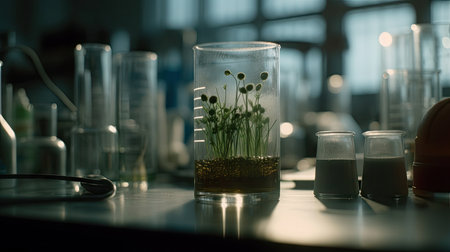 Green Plant Sprouts in Laboratory Glassware Illuminated with Soft Light. Biotechnology concept background. Generative ai.