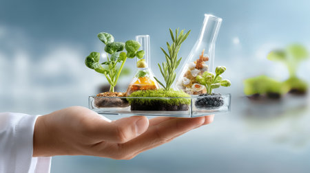 A hand holds a glass tray with laboratory flasks containing vibrant plants, showcasing the blend of scientific research and sustainable practices in modern innovation.