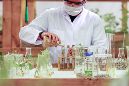 Biotechnology, Science of Genetic Engineering. Scientist experiments with genetically modified plants, laboratory, test tubes, plants obtained by new genomics techniques, mutagenesis. Generative ai.