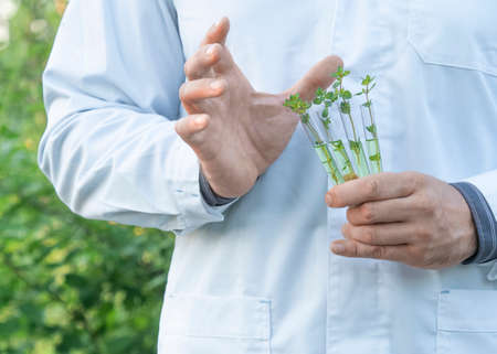 Researcher in a white coat showing test tubes with green sprouts. Outdoor.