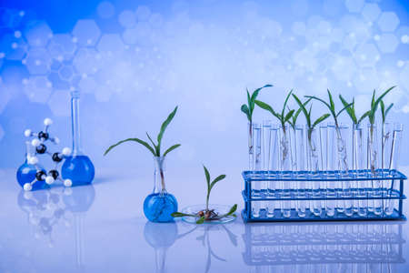 Green seedlings growing in test tubes. Biotechnology and biotechnology concept
