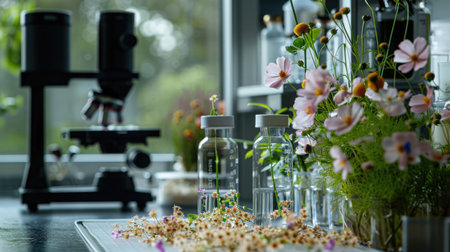 A scientist conducts detailed research in a modern laboratory, observing colorful flowers. This image captures the beauty of nature combined with scientific innovation.
