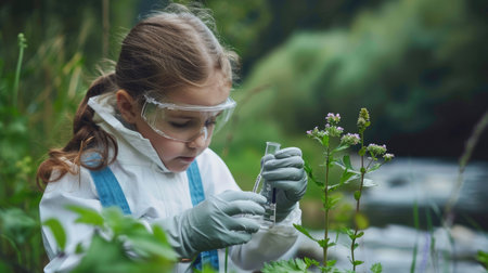 A young girl happily explores a river with a magnifying glass, observing plants, water, and grass in the natural landscape while surrounded by people enjoying leisure activities in the meadow AIG50