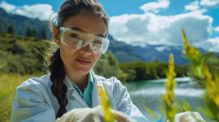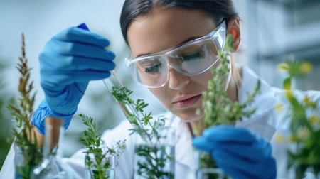 Generative AI, Female scientist is examining plants, biotechnological research of plants for agriculture
