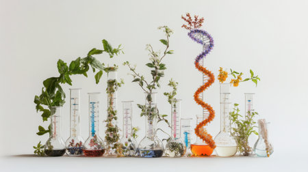 A vibrant display of various plants in laboratory glassware, showcasing the intersection of nature and science through colorful DNA models and herbal extracts.
