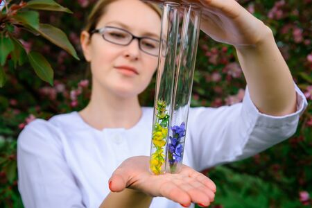 Glass test tubes with flower samples, close-up. Female hands holding flasks, blurred background. Study of plants, medicinal herbs, creation of natural floral aromas. Advertising perfume industry.