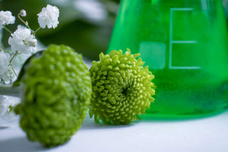 Natural drug research, Plant extraction in scientific glassware, Alternative green herb medicine, Natural organic skincare beauty products, Laboratory and development concept.