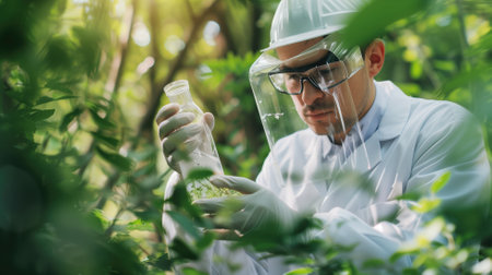 Scientists researching renewable energy, Analyzing, experiments containing and dropping plant liquid into a glassware, Science and nature