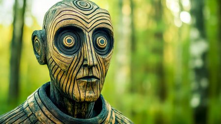 a stone carving in the forest, featuring conceptual portraiture, digital art techniques, masks, and totems. captured with a hasselblad 1600f camera, the image showcases 8k resolution and texture-rich landscapes. the stone carving stands out with its punctuated caricature design. ai generated
