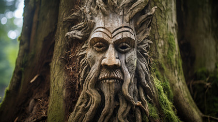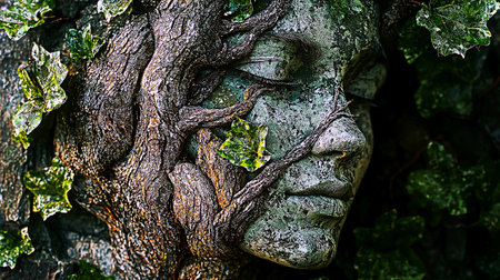 AI Generated - Tree trunk with ivy growing on it, and in the center of the image is a sculpture of a human face. Professional stock photography for commercial use. High resolution. Premium quality.