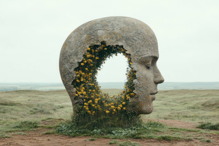 A surreal stone sculpture featuring a human head with a floral arrangement, symbolizing nature and inner peace, set against a serene green landscape