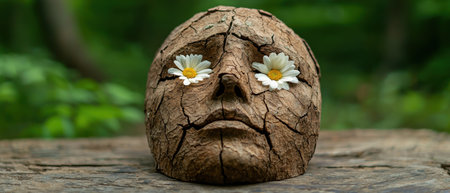 This striking close-up showcases a sculpted face adorned with vibrant flowers and lush leaves, beautifully blending artistry with nature. The intricate details highlight a harmonious connection between human expression and the organic world, evoking emotions of serenity and admiration.