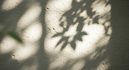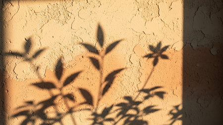 Experience a serene moment with soft shadows of leaves dancing on a warm wall, creating a comforting and tranquil atmosphere enhanced by natural light.