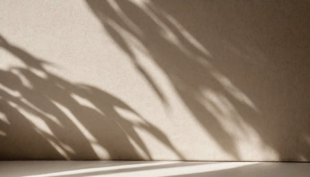 Minimalistic abstract gentle light beige background for product presentation with light and intricate shadow from the window and vegetation on wall.