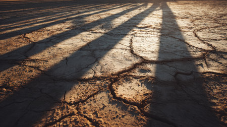 Vibrant shadows stretch across a dry, cracked earth surface, capturing the essence of nature's beauty at sunset, showcasing unique textures and warm tones.