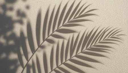 Palm leaf shadows stretch gracefully across a smooth wall, highlighting the beauty of nature in daylight.