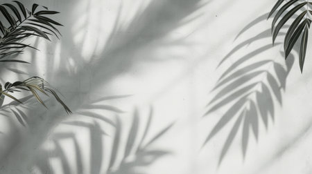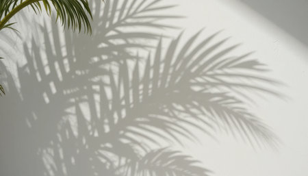 Palm leaves create intricate shadows on a white wall, capturing soft afternoon light in a serene setting.