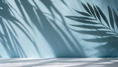 Aesthetic shadow of the palm leaves on a pastel blue background. Background for advertising your product. Creative copy space for your design. Abstract texture. Banner