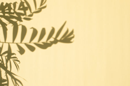 Shadows of palm tree branches on a yellow background. Natural background. Selective focus