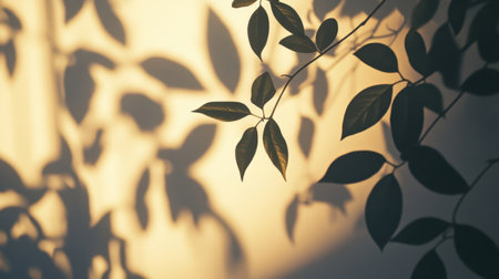 A branch with green leaves casts a shadow on a textured surface bathed in warm light.