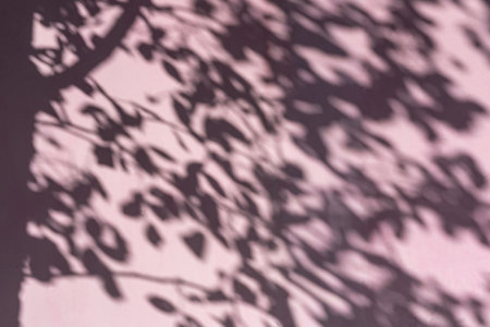 Shadow of Leaves on Wall. Blurred shadow of tree leaves on pink wall creating natural abstract pattern background with soft lighting. Concept of shadow, calm nature, pink backdrop