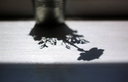 The shadow of one flower, buttercup, roses in a flowerpot on a windowsill. Abstraction, copy space. Monochrome. Black and white