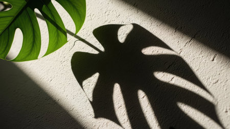 A close-up view presents a green monstera leaf and its distinct shadow cast upon a textured white surface. The composition showcases natural light and shadow play, emphasizing the leaf's form and patterns. Suitable for decorative purposes, this image could be used for various creative projects.