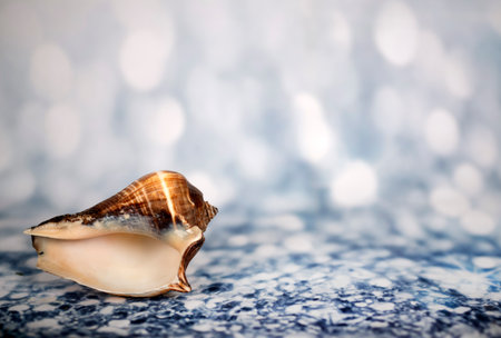 Sea shell on the sand close up as a beach background with copy space. Vacation theme concept