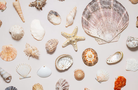 Shells, natural organic color seashell on white background with blank space for text. Travel or vacation concept. Summer background