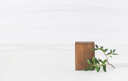 Natural wooden podium for organic eco frinedly cosmetic products with green leaves against light background. Copy space