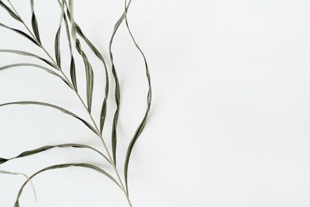 Green branches on white wooden background. Flat lay, overhead view, copy space.