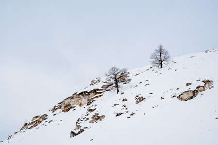 Snow-covered slope with lonely trees. Incredibly breathtaking mountain scenery. rocky peaks. clear sky. minimalism. high quality photo
