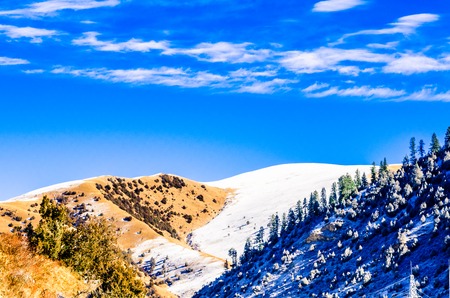 Trees covered with white snow in the himalayan mountain range of Jammu