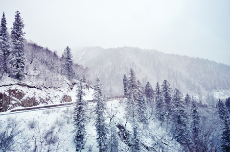 snow-covered hills in the clouds in the early winter morning in the foothills of the Caucasus. Shallow depth of field, photo toning